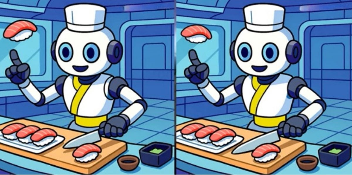 На показаните тук снимки е изобразен робот за суши. На пръв поглед двете снимки изглеждат абсолютно еднакви, но между тях има три малки разлики.
