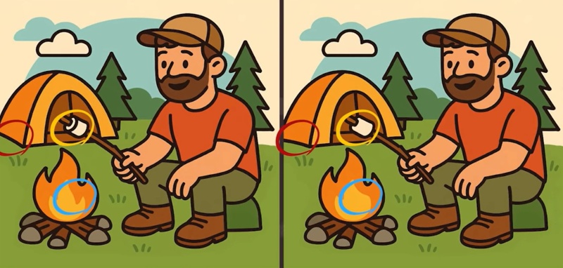 Този път ще трябва да разгледате изображенията на мъж, който пече маршмелоу на огъня. На пръв поглед те изглеждат абсолютно еднакви, но художникът е скрил три малки разлики. Разполагате само с 51 секунди, за да ги откриете!