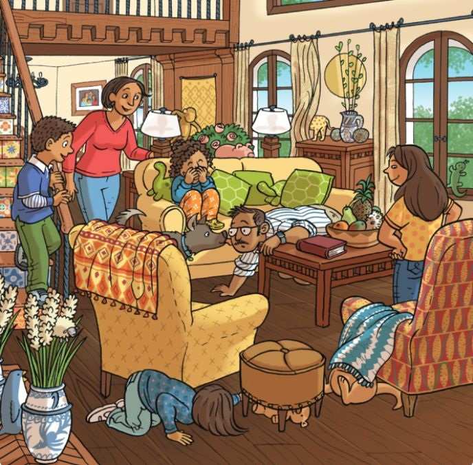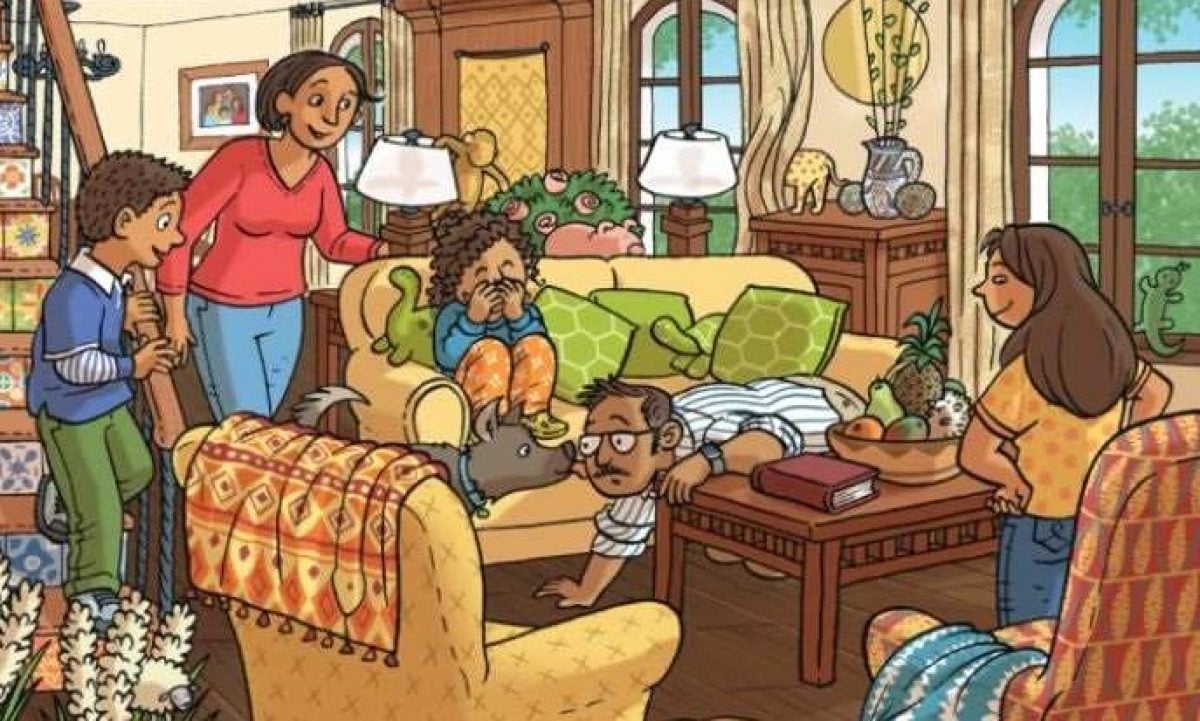 На картинката виждаме семейство, което е изгубило нещо и сега се опитва да го намери. Изгубените предмети са четка за боядисване и четка. Таткото, майката и техните деца безуспешно се опитват да намерят изгубените предмети, но все още не са успели. Трябва да помогнете на семейството в търсенето им.